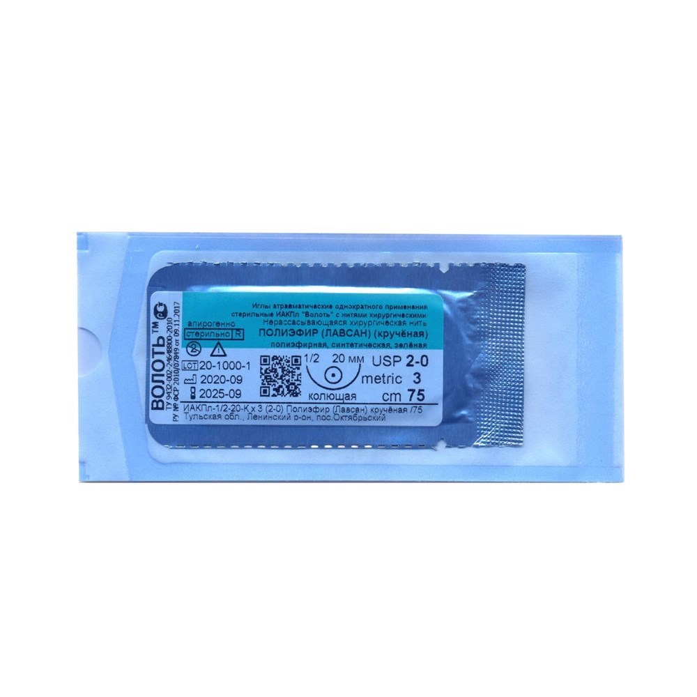 Шовный материал Полиэфир 2/0 крученая Лавсан L 75 см, игла, 20 мм, изгиб 1/2 колющая одноигольная