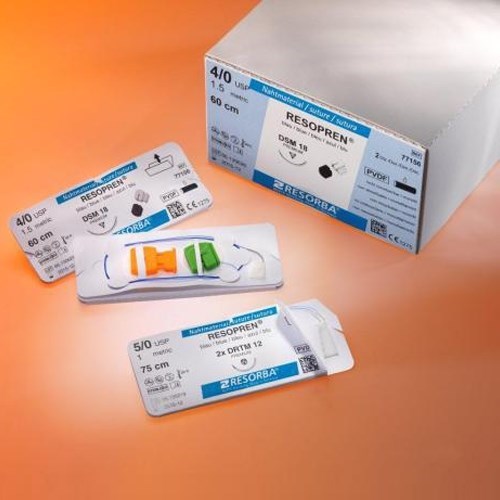 Шовный материал Резопрен. Монофиламентная, синтетическая нерассасывающаяся нить из поливинилдендифлуорида. Устойчив к ферментному воздействию со стороны организма, не подвергается гидролизу. Аналог Премилена, Пролена, Пронова. Нить: синяя (1 EP) 5-0 USP,0.45 м. Игла:13 мм, обратно - режущая, 3/8 круга. 36 шт/уп. Указана цена 1 штуки.