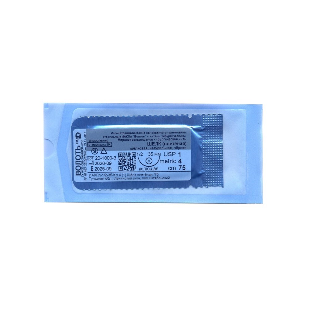Шовный материал Шелк USP №1/0 L-0/75 см игла 35 мм колющая
