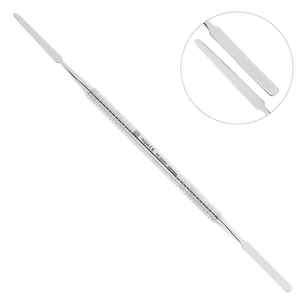 Шпатель немецкой торговой марки Nopa Instruments предназначен для смешивания цемента. Инструмент имеет удобную ручку ретенционными поперечными бороздками на поверхности, благодаря которым шпатель надежно фиксируется в руке.