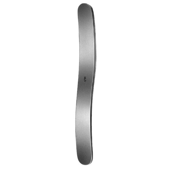 Шпатель, ширина 16 мм, длина 145 мм, OM202R, B.Braun (Aesculap, Германия) выполнен из нержавеющей стали, имеет цельнометаллическую изогнутую рабочую форму и используется для фиксации языка и щеки.