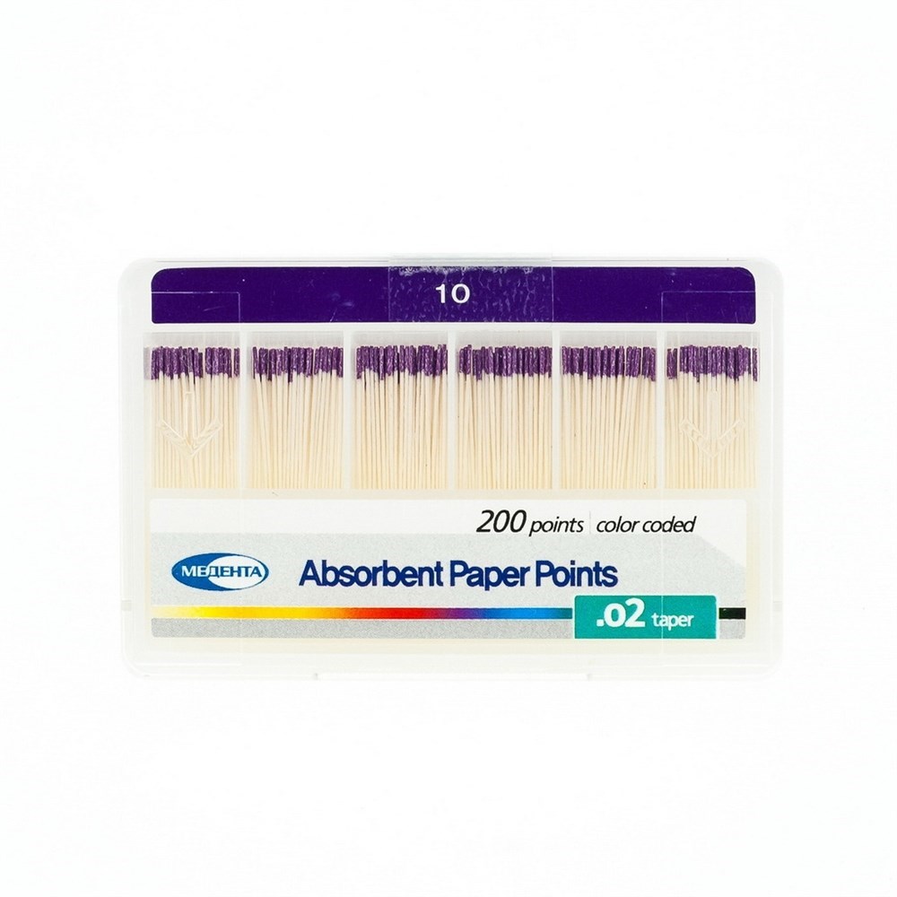 Штифты бумажные абсорбирующие - предназначены для высушивания корневых каналов. Размер № 10, конусность 02. Изготовлены из бумаги высокой абсорбирующей способности. Натуральные - не содержат примесей связующих веществ. Идеальная плотность для введения в каналы без дополнительного скручивания и сгибания. Сохраняют форму при извлечении из канала. Стерильны. Легкая идентификация - цветокодированы в верхней части штифта. Абсолютное соответствие размера стандарту ISO. Упаковка 200 шт.
