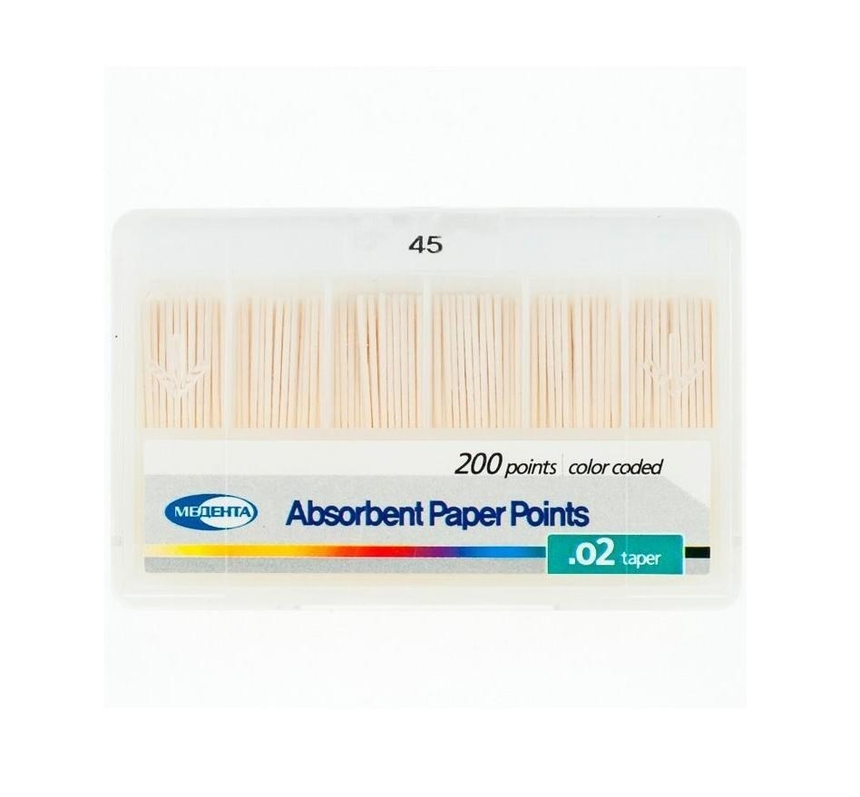 Штифты бумажные абсорбирующие - предназначены для высушивания корневых каналов. Размер № 45, конусность 02. Изготовлены из бумаги высокой абсорбирующей способности. Натуральные - не содержат примесей связующих веществ. Идеальная плотность для введения в каналы без дополнительного скручивания и сгибания. Сохраняют форму при извлечении из канала. Стерильны. Легкая идентификация - цветокодированы в верхней части штифта. Абсолютное соответствие размера стандарту ISO. Упаковка 200 шт.