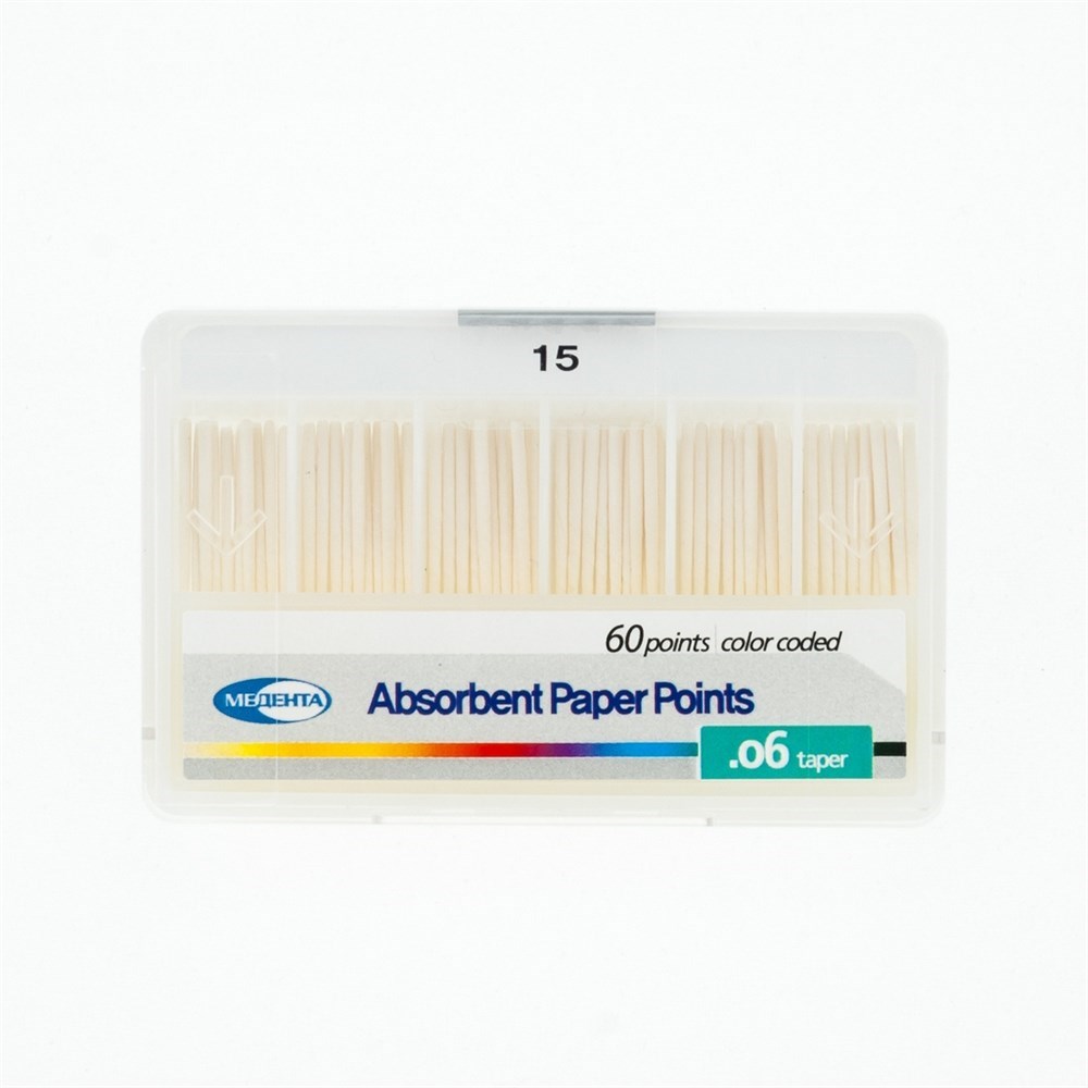 Штифты бумажные абсорбирующие - предназначены для высушивания корневых каналов. Размер № 15, конусность 06. Изготовлены из бумаги высокой абсорбирующей способности. Натуральные - не содержат примесей связующих веществ. Идеальная плотность для введения в каналы без дополнительного скручивания и сгибания. Сохраняют форму при извлечении из канала. Стерильны. Легкая идентификация - цветокодированы в верхней части штифта. Абсолютное соответствие размера стандарту ISO. Упаковка 60 шт.