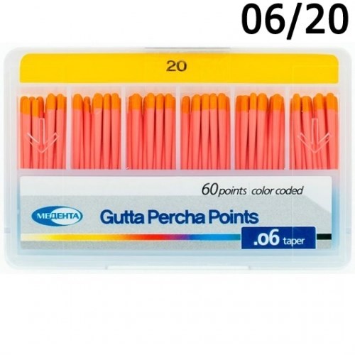 Описание: Штифты гуттаперчевые .06 №20 (60шт), MetaШтифты и стержни эндоканальные гуттаперчевые являются основным материалом для пломбирования корневых каналов в комбинации с эндодонтическим силером.