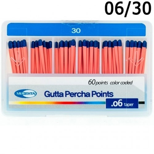 Описание: Штифты гуттаперчевые .06 №30 (60шт), MetaШтифты и стержни эндоканальные гуттаперчевые являются основным материалом для пломбирования корневых каналов в комбинации с эндодонтическим силером.