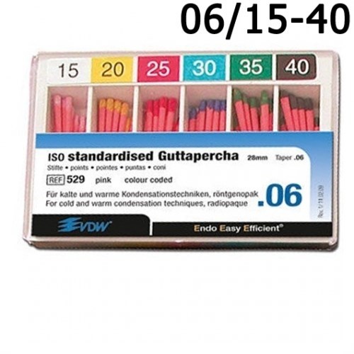 Описание: Штифты гуттаперчевые конусные 06 №15-40 (60шт),VDWШтифты стоматологические гуттаперчевые (Guttapercha points) от VDW.
