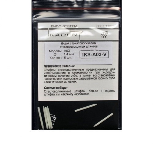 Описание: Штифты Ikadent IKS-A03-V (6шт.) стекловолоконные цилиндр заточенныйЭндоканальные штифты «IKADENT» применяются в качестве армирующего (усиливающего) элемента для эстетической реставрации частично разрушенной коронки зуба при эндодонтическом лечении. Эти штифты используются во всех группах зубов при сохранении минимум двух стенок естественной коронки. В силу отсутствия плеча (опорного элемента) штифты не предназначены для композитных реставраций при значительном повреждении или полной утрате естественной коронки, а также крепления на них металлокерамических коронок, мостов и прочих объемных конструкций.