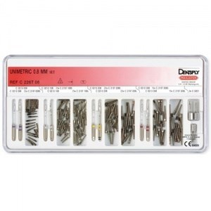 Штифты эндоканальные титановые Unimetric - набор штифтов с диаметром внутрикорневой части 1,0 мм. Применяются в эндодонтии в качестве армирующего элемента для восстановления частично разрушенной коронки зуба пломбировочным материалом. Оптимально сочетают в себе цилиндрический и конический участки внутрикорневой части, что предотвращает раскол корня или его перфорацию в процессе установки и дальнейшего использования. Изготовлены из титанового сплава.
