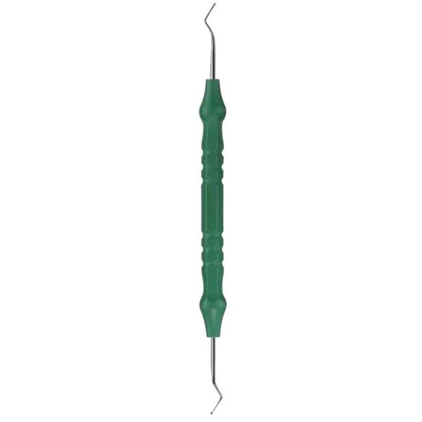 Штопфер, 1,0/0,8 мм, длина 175 мм, эксосевой, DE050R, B.Braun (Aesculap, Германия) состоит из эргономичной ручки зеленого цвета с выпуклостями, которые обеспечивают крепкий захват и не позволяют выскальзывать из руки специалиста во время проведения работ. Инструмент применяется для внесения и предварительного распределения пломбировочного материала в кариозной полости зуба. Он имеет двухстороннюю рабочую часть из нержавеющей стали с особой формой головки, благодаря которой, штопфер позволяет максимально плотно прижать материал к стенкам полости, что исключает риск образования воздушных каверн в пломбе.