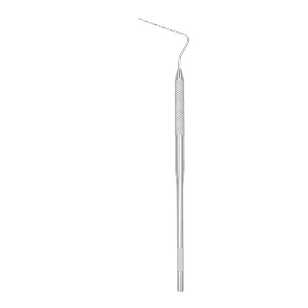 Изогнутый стержень помогает работать на отдаленных участках полости рта. Желтая маркировка на ручке соответствует размеру наконечника по стандартам ISO = 0,5 мм. Также представлено еще 3 модели: с серой, синей и черной маркировкой.