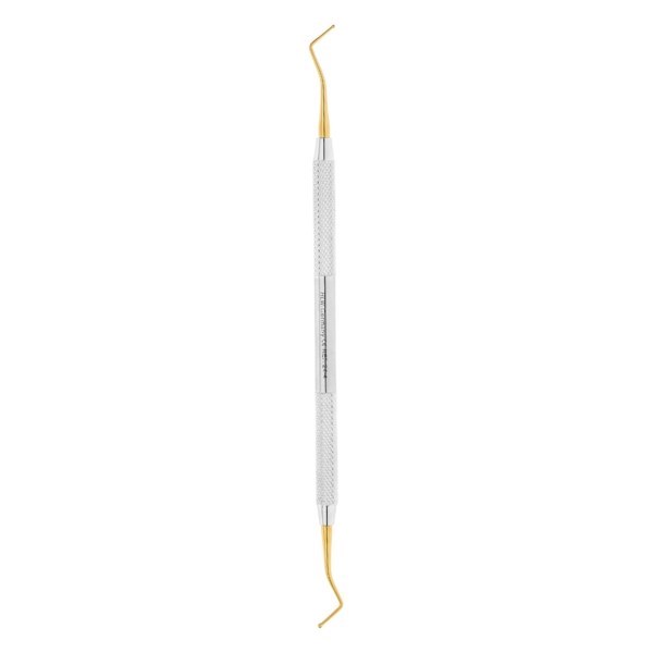 Штопфер меньшего радиуса на длинном терминальном колене удобен для внесения лечебных прокладок на проекцию рогов пульпы и для запечатывания устьев каналов цементными или иными материалами. Промежуточные и рабочие части покрыты нитрид-титановым напылением. Ручка стандартного диаметра с ретенционным рисунком в дистальных третях.