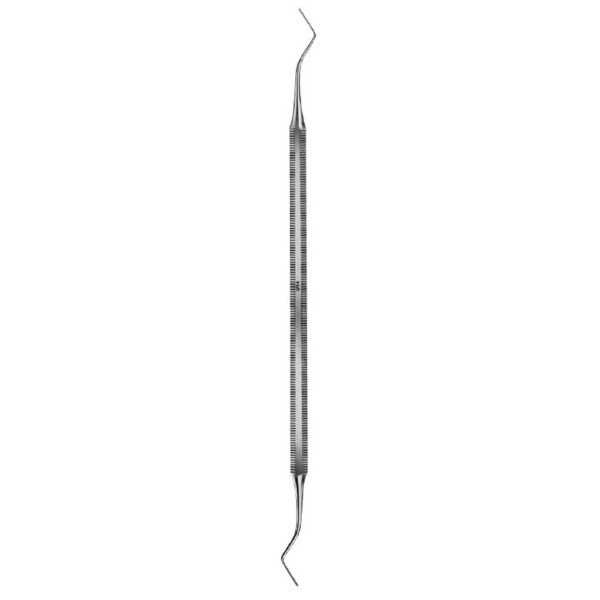Штопфер, контругловой, 0,8/1,0 мм, длина 170 мм, DE125R, B.Braun (Aesculap, Германия) изготовлен из высококачественной нержавеющей стали и состоит из многогранной ручки с поперечными насечками, которые обеспечивают крепкий захват и не позволяют выскальзывать из руки специалиста во время проведения работ. Инструмент применяется для внесения и предварительного распределения пломбировочного материала в кариозной полости зуба. Он имеет двухстороннюю рабочую часть с особой формой головки, благодаря которой, штопфер позволяет максимально плотно прижать материал к стенкам полости, что исключает риск образования воздушных каверн в пломбе.