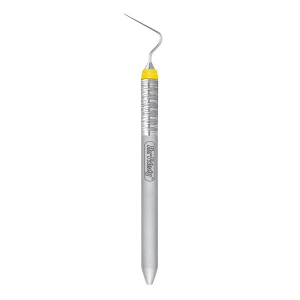 Широкая цилиндрическая ручка не напрягает кисть стоматолога во время работы. Желтая силиконовая вставка помогает легко идентифицировать инструмент.