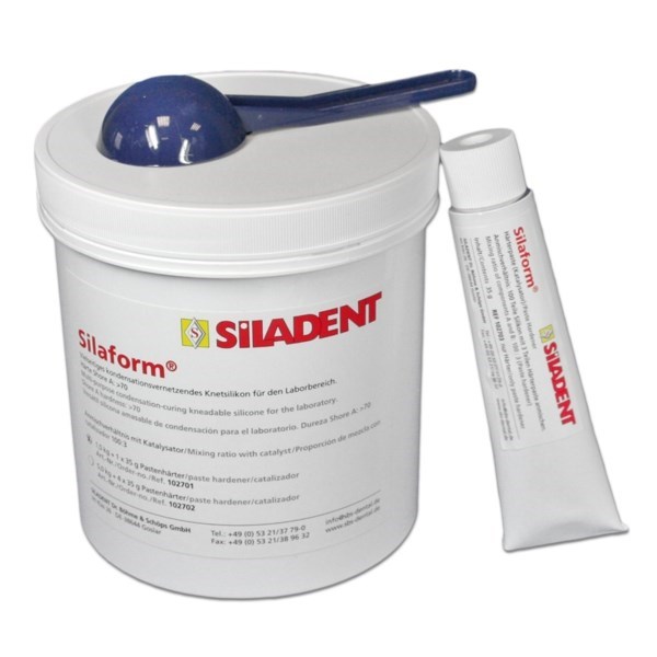 Пастообразный двухкомпонентный С-силикон Silaform с отвердителем в тюбике имеет широкие применение в зуботехнической лаборатории: изготовление силиконовых оттисков, устранение поднутрений, ремонт моделей, регистрация прикуса и многое другое. Соотношение смешивания компонента А с компонентом В - 100:3.