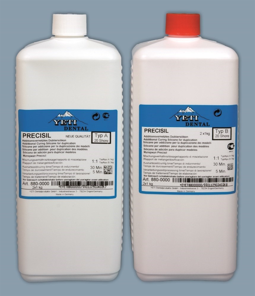PRECISIL - двух компонентный дублирующий материал на основе силикона, обеспечивающий копию высокой степени точности. Высокая эластичность и прочность на разрыв гарантирует устойчивость к деформации. Отличная детальность копии и устойчивость формы позволяют многократно ее использовать. Пригоден для дублирования из гипса и паковочной массы. Твердость по Шкале Шора А18-20, дозирование 1:1. Цвет голубой. Упаковка емкость с компонентом А - 1 кг, емкость с компонентом В - 1 кг. Срок годности 24 месяца.