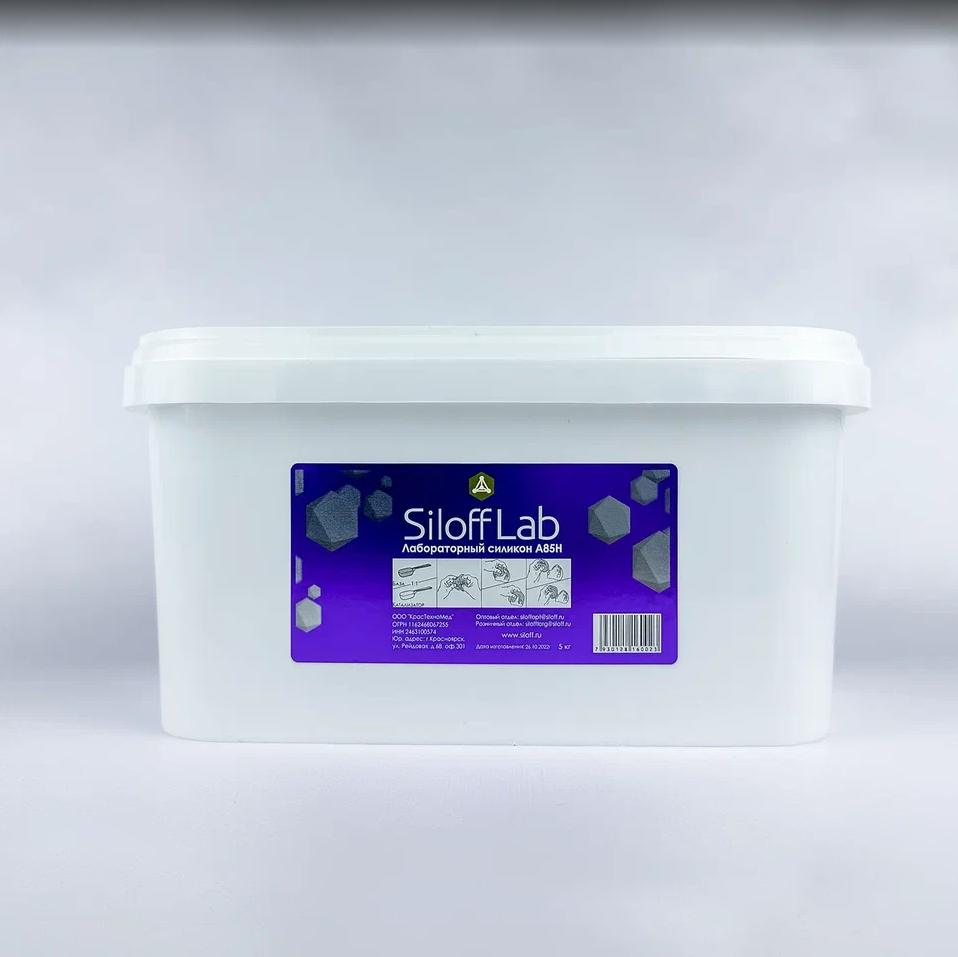 Siloff силикон лабораторный представляет собой А-силикон, состоящий из двух компонентов: базы 2,5 кг и катализатора 2,5 кг, смешивается в пропорции 1:1. Твердость по Шору - 85.