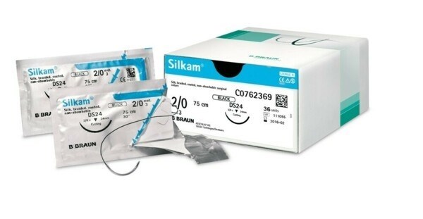 Силкам шелк черный 4/0 (1,5) 75 см HRT17, C0760137, (Bbraun) - нерассасывающийся плетеный шовный материал с покрытием из воска, изготовленный из волокон натурального шелка. Нить Silkam имеет плетенную структуру, для лучшей визуализации окрашена в черный цвет. Она может использоваться в различных областях хирургии, где необходимо применять нерассасывающийся шовный материал.