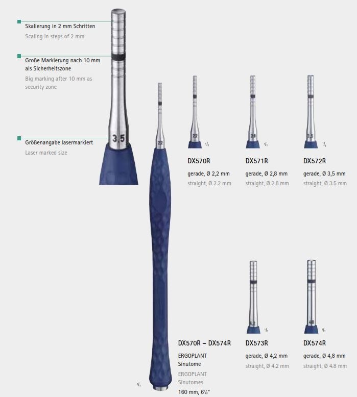 Остеотом, ERGOPLANT, прямой, 4,8 мм, DX574R, B.Braun (Aesculap, Германия) имеет удобную эргономичную ручку синего цвета. Рабочая часть инструмента изготовлена из нержавеющей стали, на ней имеется нестираемая лазерная маркировка размера, шкалы с шагом в 2 мм, а также обозначена зона безопасности. Данный остеотом применяется для поднятия гайморовой пазухи.