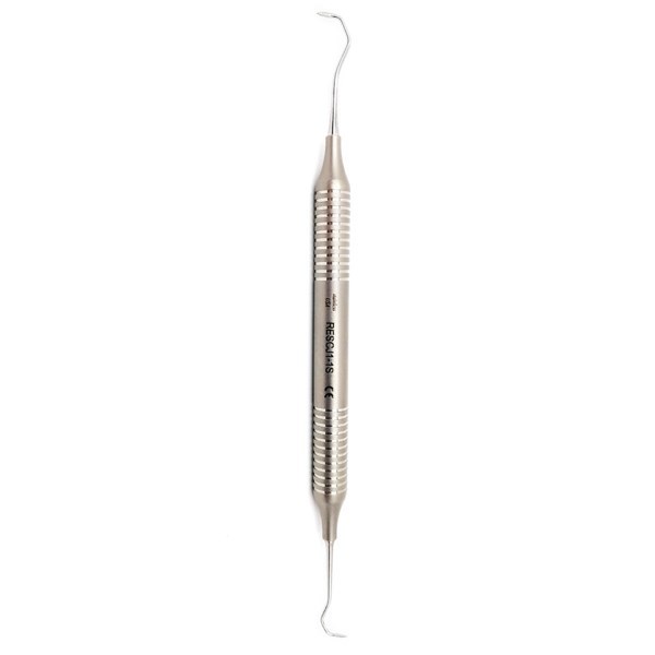 Скейлер Джакветте, двусторонний, круглая рукоятка, для передних зубов. Большое лезвие имеет длину 5 мм и ширину 1 мм, маленькое лезвие имеет длину 4 мм и ширину 0,9 мм, оба лезвия сужаются к острию.