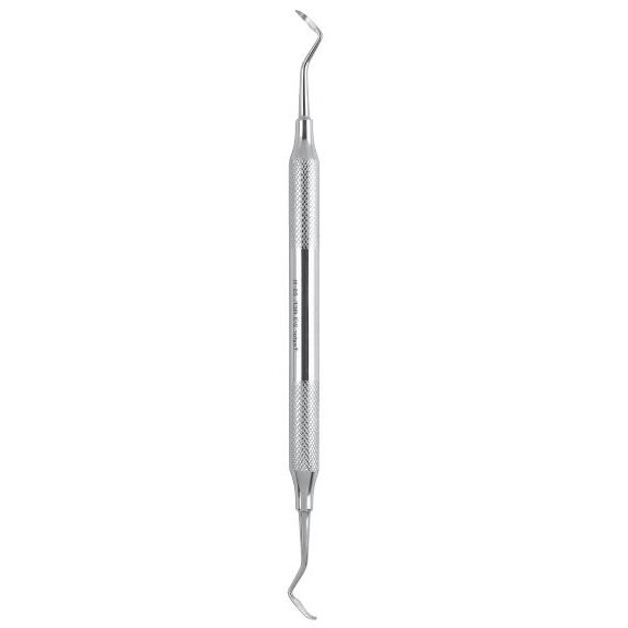 Инструмент эффективен для снятия зубных отложений с апроксимальных поверхностей дистальной группы зубов верхней и нижней челюстей. Ретенционные пункты нанесенные на ручку облегчают работу при возвратно-поступательных движениях с нажимом, предотвращая выскальзывание инструмента. Диаметр ручки не более 8 мм.