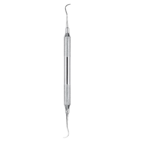 Оба рабочих конца двустороннего скейлера имеют форму полукруга с закругленным окончанием и двумя режущими кромками, расположенными под углом в 900 относительно терминального стержня. Такая конструкция инструмента обеспечивает эффективную обработку всех поверхностей фронтальной и боковой группы зубов.