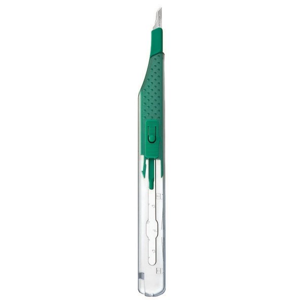 Перед использованием лезвие скальпеля выталкивается из прозрачного протектора с помощью толкающего механизма. После использования толкатель тянет лезвие назад до тех пор, пока предохранительный механизм на задней части рукоятки скальпеля не зафиксирует его на месте, что сделает невозможным повторное использование.