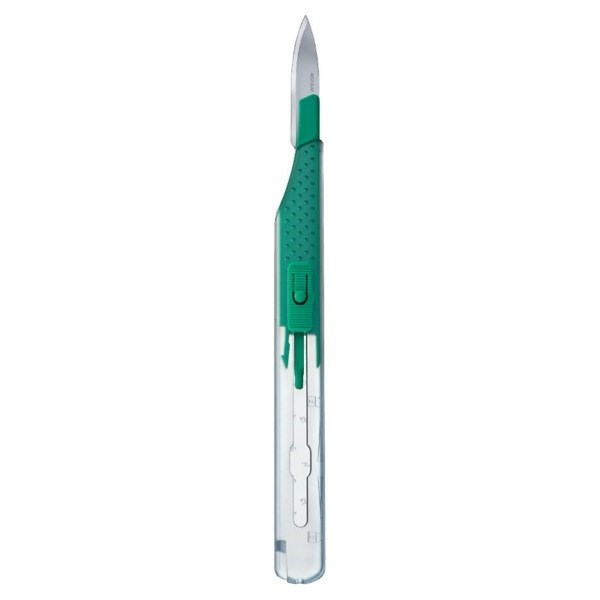 Перед использованием лезвие скальпеля выталкивается из прозрачного протектора с помощью толкающего механизма. После использования толкатель тянет лезвие назад до тех пор, пока предохранительный механизм на задней части рукоятки скальпеля не зафиксирует его на месте, что сделает невозможным повторное использование.