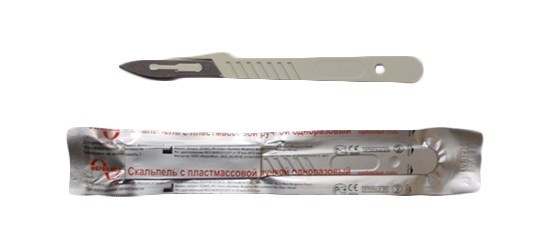 Скальпель хирургический стерильный одноразового использования. Форма лезвия № 15 - серповидная с внутренней заточкой. Предназначен для рассечения мягких тканей и сосудов при различных хирургических вмешательствах. Лезвие из нержавеющей или углеродистой стали. Стандартный угол заточки 12–25°. Ручка-держатель из полистирола ABS. Шейка ручки имеет ребристую поверхность и снабжена анатомическим упором для обеспечения удобной и надежной фиксации инструмента пальцами хирурга. Упаковка 10 шт.