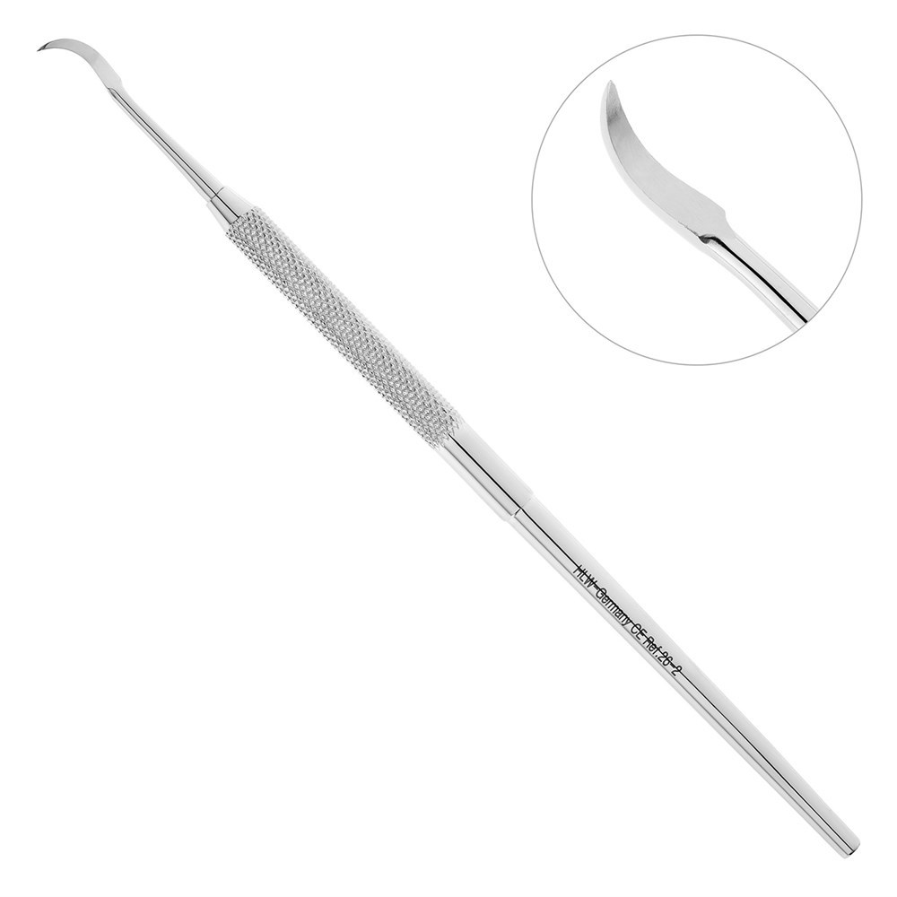 Стоматологический инструмент имеет одну изогнутую рабочую часть, лицевая поверхность которой имеет копьевидную форму с двумя режущими кромками и острым кончиком. Угол между лицевой поверхностью и терминальным стержнем составляет 90°. Такая конструкция скейлера позволяет вводить режущую часть на несколько миллиметров внутрь десны и эффективно ликвидировать отложения на поверхности зуба.
