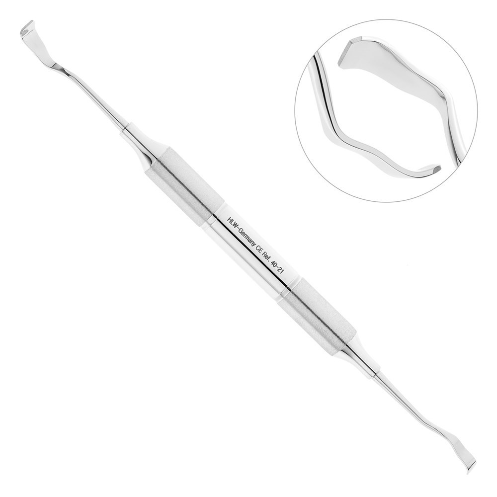 Двусторонний скейлер представляет собой держатель в виде стержня, на обоих концах которого расположены асимметричные рабочие части. Оба окончания инструмента выполнены в виде изогнутых лопаток с режущими гранями. Широкий конец скейлера идеально подходит для сглаживания гребня челюсти перед имплантацией, а также для дополнительного сбора костного материала в области операции. Обе рабочие части инструмента хорошо срезают костную стружку без дополнительных усилий.