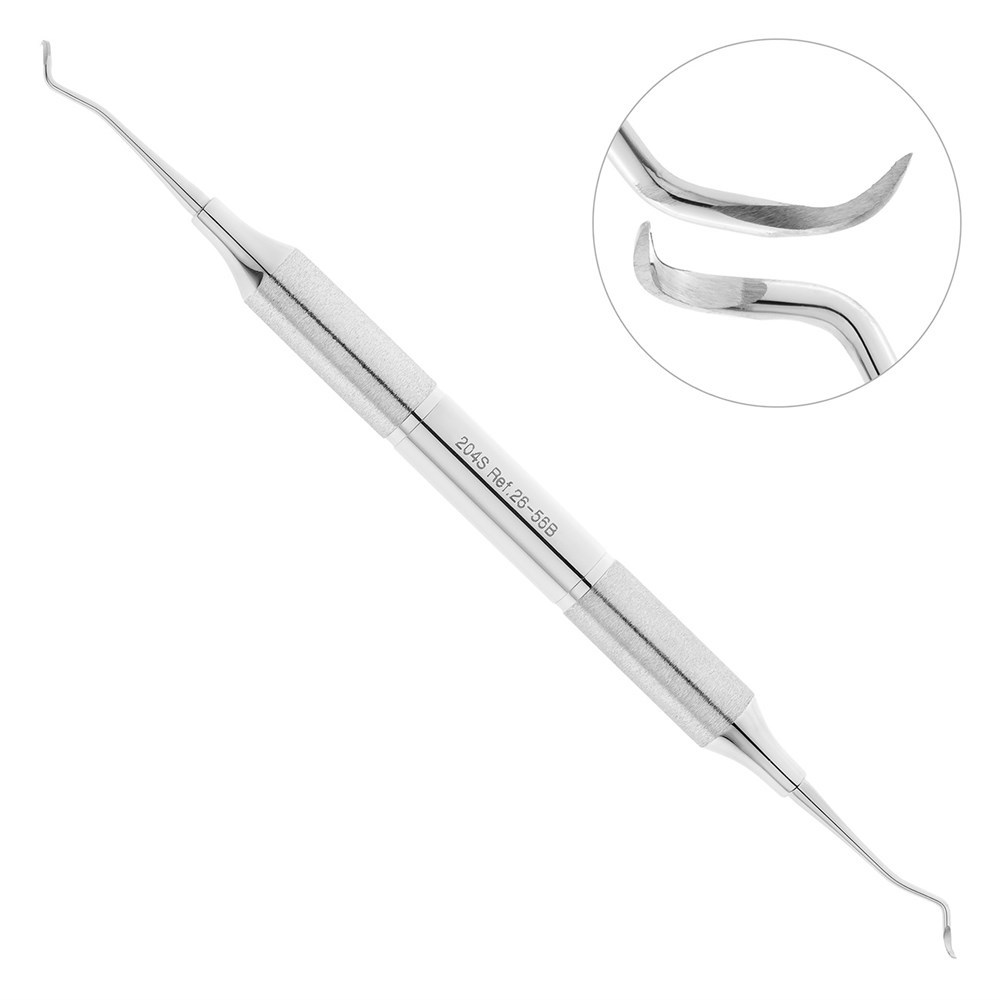 Оба рабочих конца двустороннего инструмента оснащены двумя режущими кромками, которые расположены под тупым углом по отношению к терминальному стержню. Такая конструкция рабочей части скейлера позволяет наилучшим образом лезвию адаптироваться к поверхностям зубов, не травмируя мягкие ткани.
