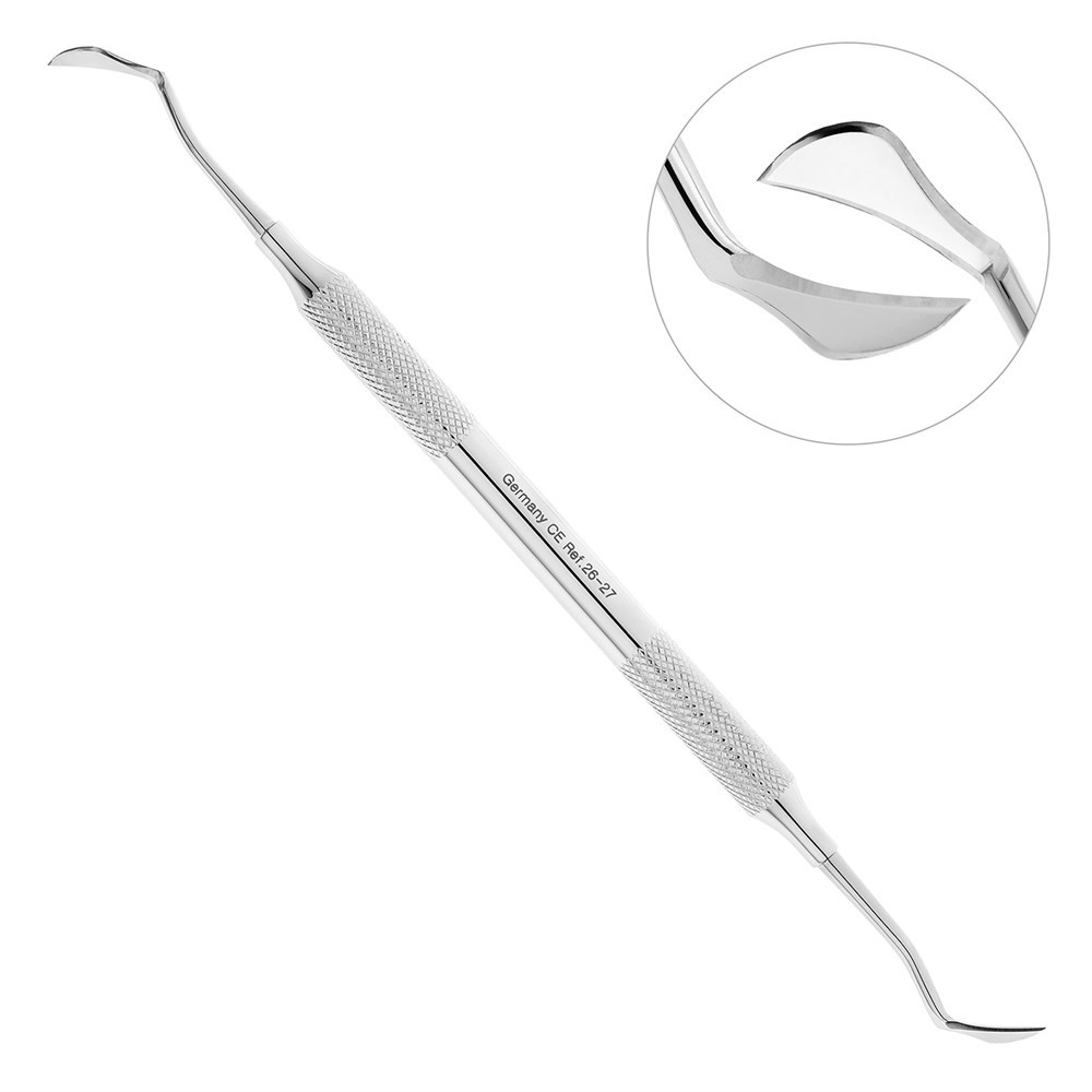 Рабочие грани двустороннего скейлера остро заточены, что позволяет без сдавления производить фрагментацию мягких тканей десны при проведении лоскутных операций и иссечении гипертрофированной десны.
