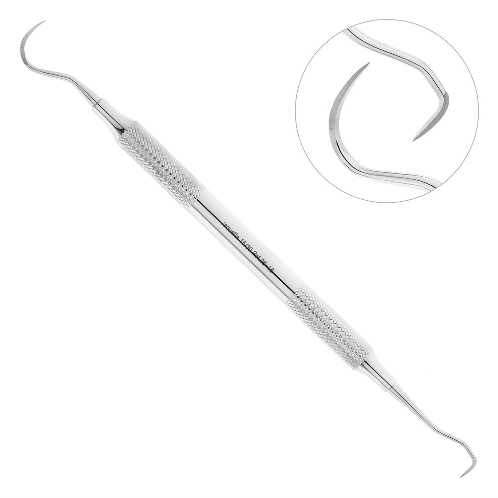 Оба рабочих конца двустороннего инструмента имеют серповидную форму с заостренным окончанием и двумя режущими кромками, расположенными под прямым углом относительно терминального стержня. Благодаря чему лезвие наилучшим образом адаптируется к поверхностям зубов, не травмируя мягкие ткани.