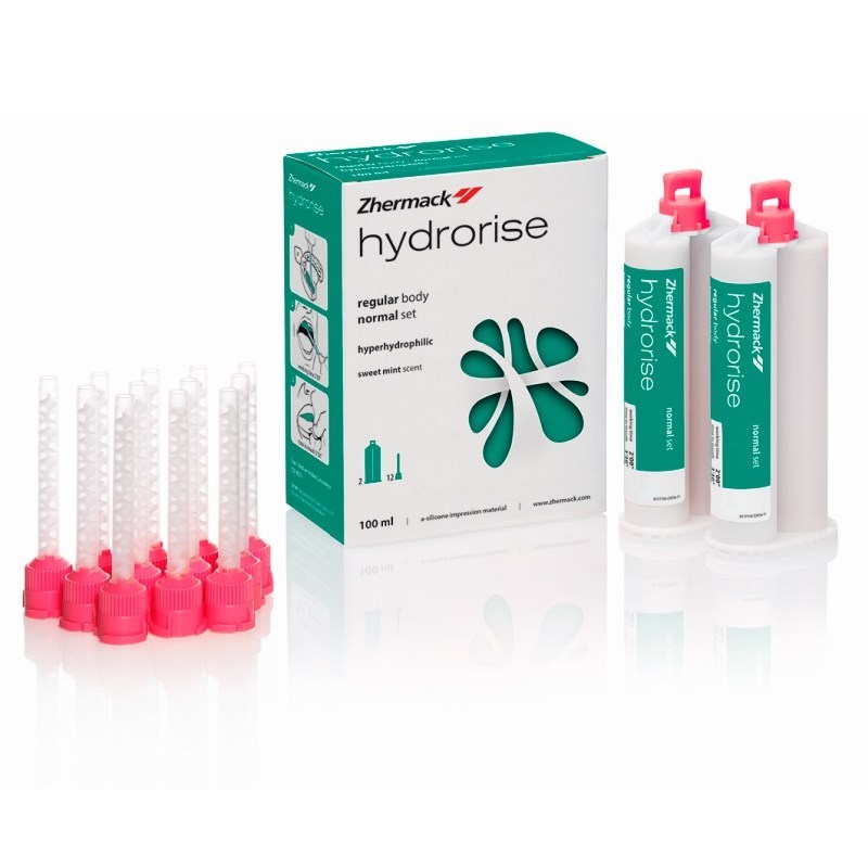 Hydrorise Regular Body Normal Set гипергидросовместимый силикон средней вязкости для съемных и несъемных протезов. Данный оттискный материал рекомендуется для одноэтапной техники (одновременной) в сочетании с Hydrorise Putty или Heavy body, либо, как монофазный материал для индивидуальной оттискной ложки.