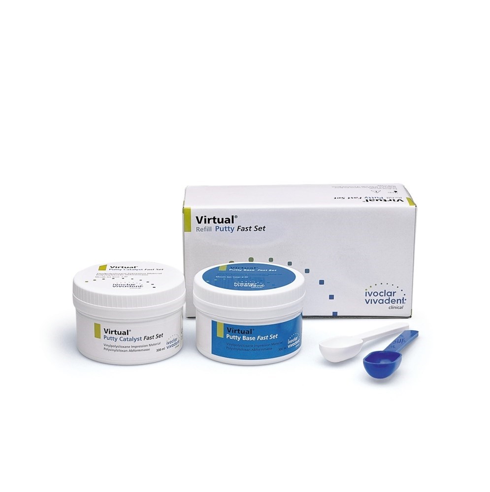 Virtual Refill Putty Fast слепочный материал. Virtual это современная линия поливинилсилоксановых слепочных материалов для получения слепков различными способами. Линия продуктов Virtual содержит массы пяти вязкостей: Putty, Heavy Body, Monophase, Light Body и Extra Light Body с быстрым временем схватывания «Fast» (2:30 мин) и обычным «Regular» (4:30 мин.). В программе также предлагается адгезив для слепочных ложек и другие принадлежности.