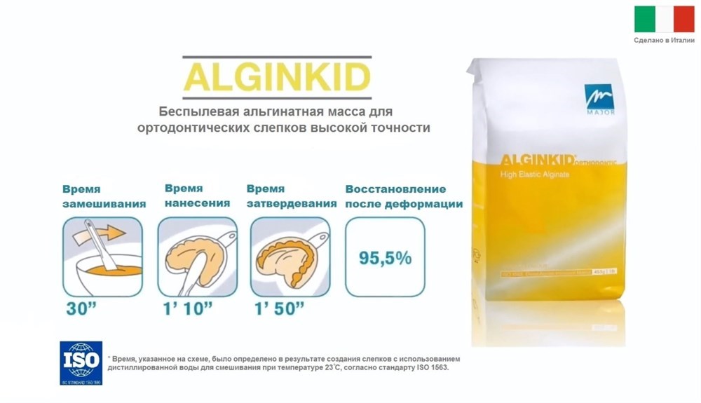 AlginKid- беспылевая альгинатная слепочная масса для ортодонтических слепков. Особая химическая формула обеспечивает экстра прочность на разрыв, препятствующая повреждению слепка о металлические брэкеты.