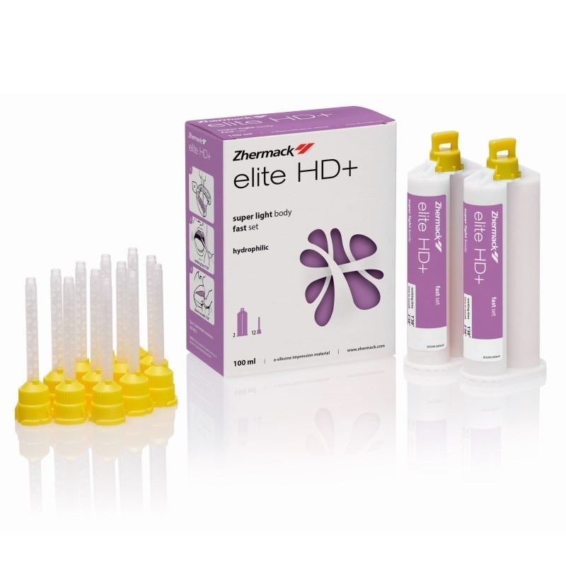 Слепочная масса ELITE HD+ SUPER LIGHT FAST SETTING для несьёмных протезов (2 картриджа по 50 мл, 12 смесительных наконечников) база и катализатор корригирующего слоя.