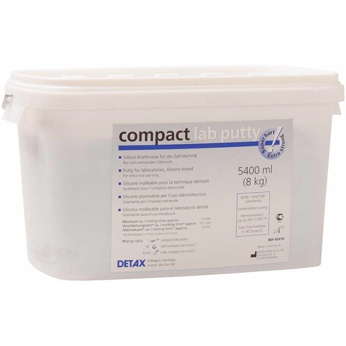 Compact lab putty разминаемый зуботехнический силикон на основе С-силикона, особенно мягко-пластичная начальная консистенция, высокая окончательная твердость (по Шору 90 А), жароустойчивый. Пригоден для разнообразных показаний (надежная фиксация искусственных зубов, вестибулярные валики, модели, изоляция и т.д.). Рабочее время можно варьировать индивидуальным дозированием катализатора. Точное отображение деталей, стабильность форм и объема.