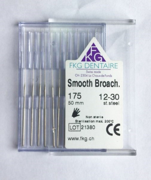 Ручной стоматологический эндодонтический инструмент Smooth Broaches с рабочей частью в форме гранёной иглы используется в качестве зонда для изучения направления, определения размера и степени прохождения корневого канала, а также для внесения лекарственных средств в корневой канал или высушивания канала при помощи ватных турунд.