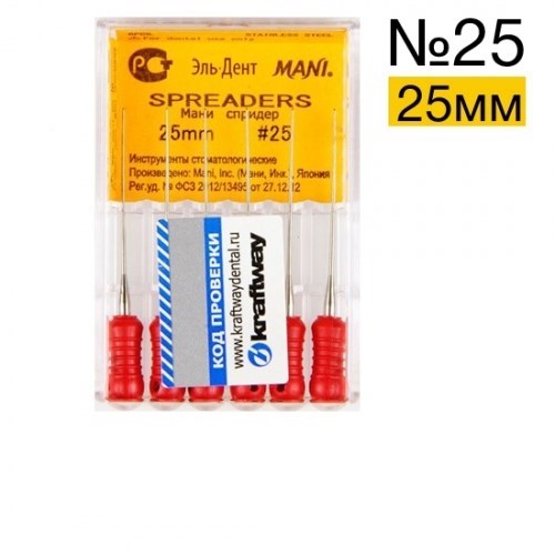 Mani Spreaders - Ручной стоматологический эндодонтический инструмент с рабочей частью в форме гладкого усечённого стержня с конусообразным концом. Материал рабочей части - нержавеющая сталь, материал рукоятки – пластик (полибутилентерефталат).