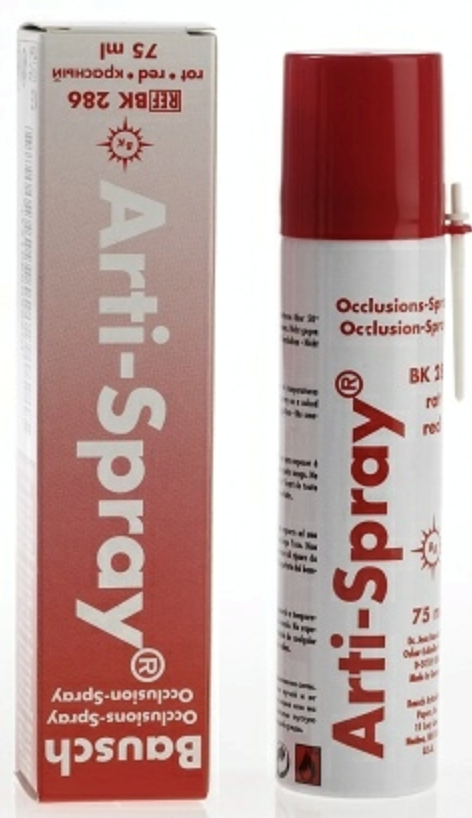 Места контактных пунктов можно пометить цветным карандашом или фольгой Бауша Arti-Fol. Arti-Spray® можно также использовать для контроля аппроксимальных контактов при подгонке мостовидных протезов или коронок. Arti-Spray® состоит из физиологически нейтральных веществ.