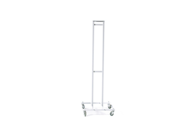 Передвижная стойка содержит четыре резиновых колёсика для перемещения по поверхности пола. Для фиксации подставки передвижной колёса снабжены специальным тормозным устройством. Подставка выполнена из профильной стальной трубы 20х20 мм и покрыта химически стойким порошковым покрытием. При необходимости подставка может легко разбираться и размещаться в небольшом объёме.