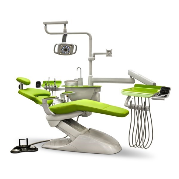 - Декоративные элементы стола врача, стола ассистента и гидроблока выполнены из крепкого орг стекла под цвет обивки кресла, всего в наличии 4 цвета: зеленый, синий, красный, черный