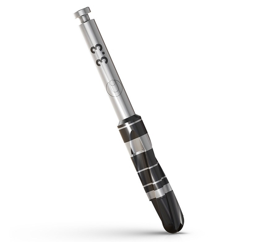 Сверло спиральное выполнено из хирургической нержавеющей стали. На одном из своих концов оно имеет фитинг для соединения с угловым наконечником. Рабочий конец имеет цилиндрический профиль и режущую геометрию, совместимую с дентальными имплантатами. Сверло имеет лазерную маркировку для определения глубины сверления в соответствии с хирургическим планированием.Применяется для сверления костной ткани при подготовке хирургического ложа перед установкой выбранного дентального имплантата.