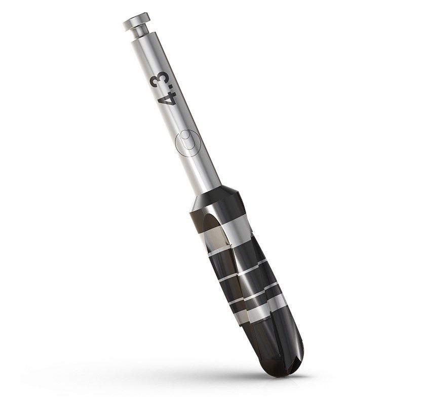 Сверло спиральное выполнено из хирургической нержавеющей стали. На одном из своих концов оно имеет фитинг для соединения с угловым наконечником. Рабочий конец имеет цилиндрический профиль и режущую геометрию, совместимую с дентальными имплантатами. Сверло имеет лазерную маркировку для определения глубины сверления в соответствии с хирургическим планированием.Применяется для сверления костной ткани при подготовке хирургического ложа перед установкой выбранного дентального имплантата.
