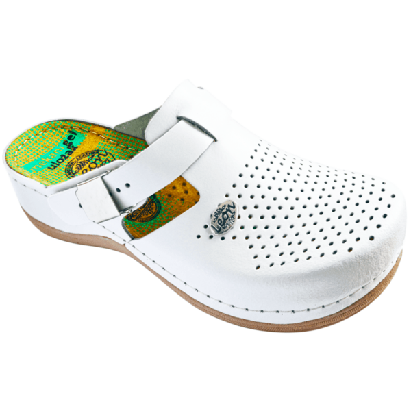 Женские сабо Леон 950 выполнены из высококачественной натуральной кожи с перфорированным верхом, за счет чего, внутри создает комфортный климат и кожа ног "дышит". Модель имеет ремешок на пряжке, благодаря которому можно регулировать обувь по своей ноге. Сабо имеют широкий, комфортно облегающий носок, исключающий деформацию пальцев ног и неприятное давление на суставы.Массажная гелиевая стелька модели помогает при болях в суставах, мышцах и спине, а также значительно снижает давление на стопу, правильно распределяя нагрузку по всех поверхности ступни. Легкая полиуретановая подошва модели 950 обладает выраженным противоскользящим эффектом, обеспечивая обуви максимальную устойчивость в любых ситуациях.