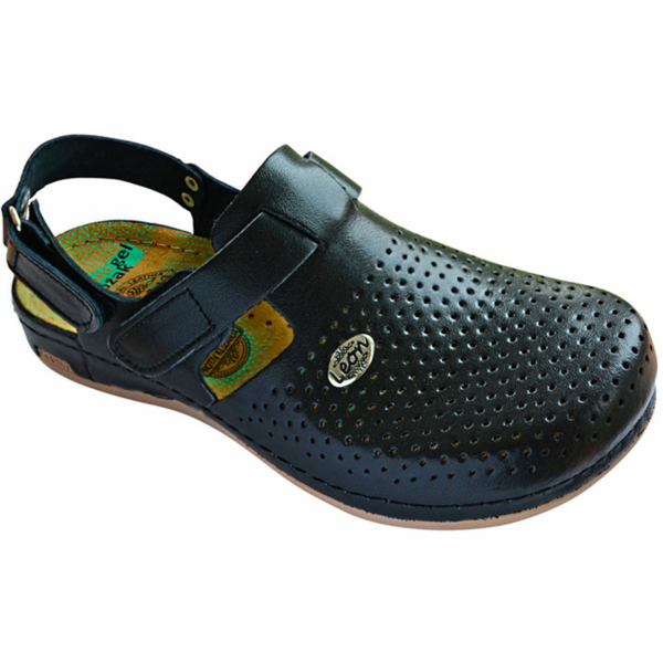 Женские тапочки-сабо Леон 951 — стильная и модная модель обуви из натуральной кожи. Закрытый носок и классический дизайн делают модель универсальной обувью для летних прогулок или ежедневного ношения на работе. ЛЕОН сабо 951 имеют хорошую перфорацию, создающую комфорт и предотвращают потоотделение. Элегантный ремешок, застегивающийся сбоку, дополнительно фиксирует обувь на ноге, позволяя осуществлять корректировку ширины модели.
