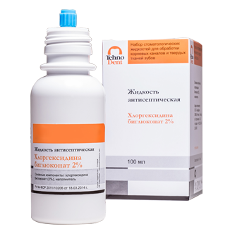 Жидкость антисептическая на основе 2% хлоргексидина биглюконата для обработки зуба перед пломбированием, антисептической обработки корневых каналов при пульпитах и периодонтитах (100 мл, флакон)