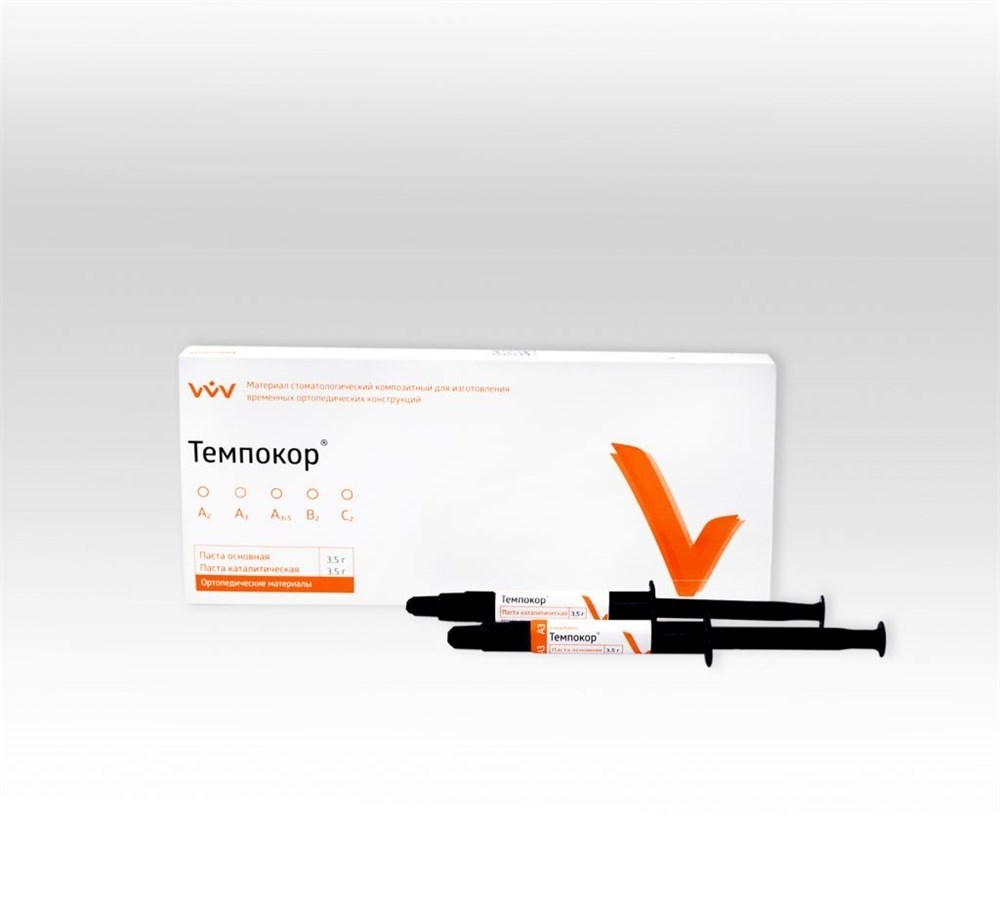 «Темпокор» - полимерный композитный материал на основе многофункциональных метакрилатов выпускается в виде двух паст (основной и каталитической) разных цветовых оттенков (А2, А3, А3,5, В2, С2, по шкале VITA). Полученный в результате смешивания равных количеств паст композитный цемент отверждается в течение короткого времени с образованием прочного материала.